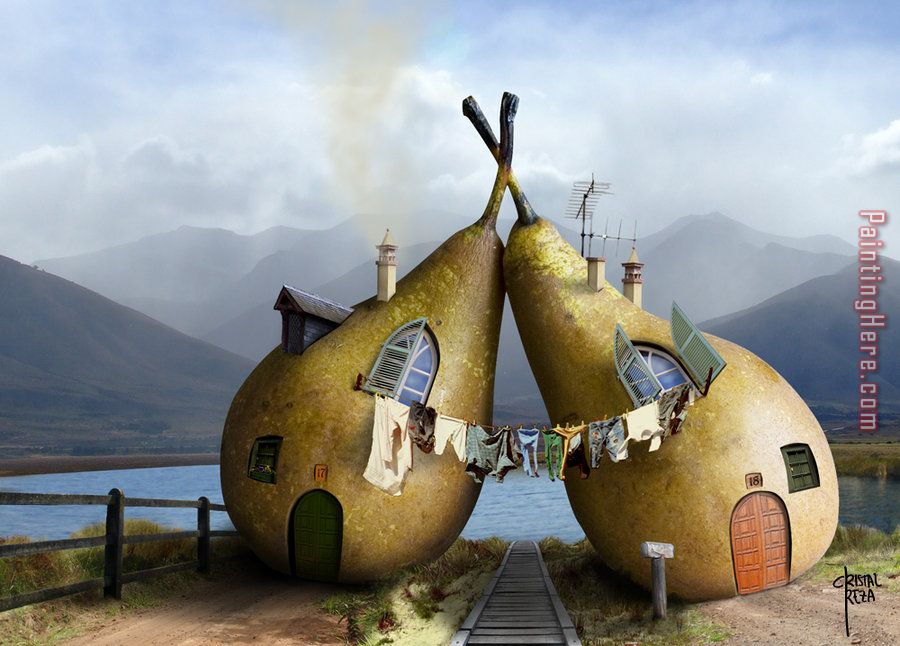 This unknown artist twin pear houses cristal reza needs 14 -18 days for production. Please keep in mind that all of our products are waterproof on textured canvas! We ship twin pear houses cristal reza all over the world.